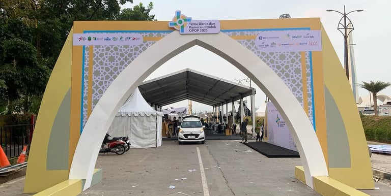 Lembaga Bisnis berkumpul dalam event OPOP 2023 dengan dekorasi dan layout yang meriah dan profesional